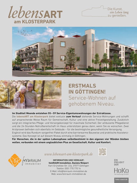 Ein Service-Wohnkonzept, welches es so in Göttingen noch nicht gegeben hat, entsteht in Weende am Klosterpark. Selbstbestimmt leben und selbstbestimmt bleiben, diesem Wunsch entspricht die neuartige Wohnanlage. Sie finden in der Rubrik „Bauen & Wohnen“ ausführliche Informationen.